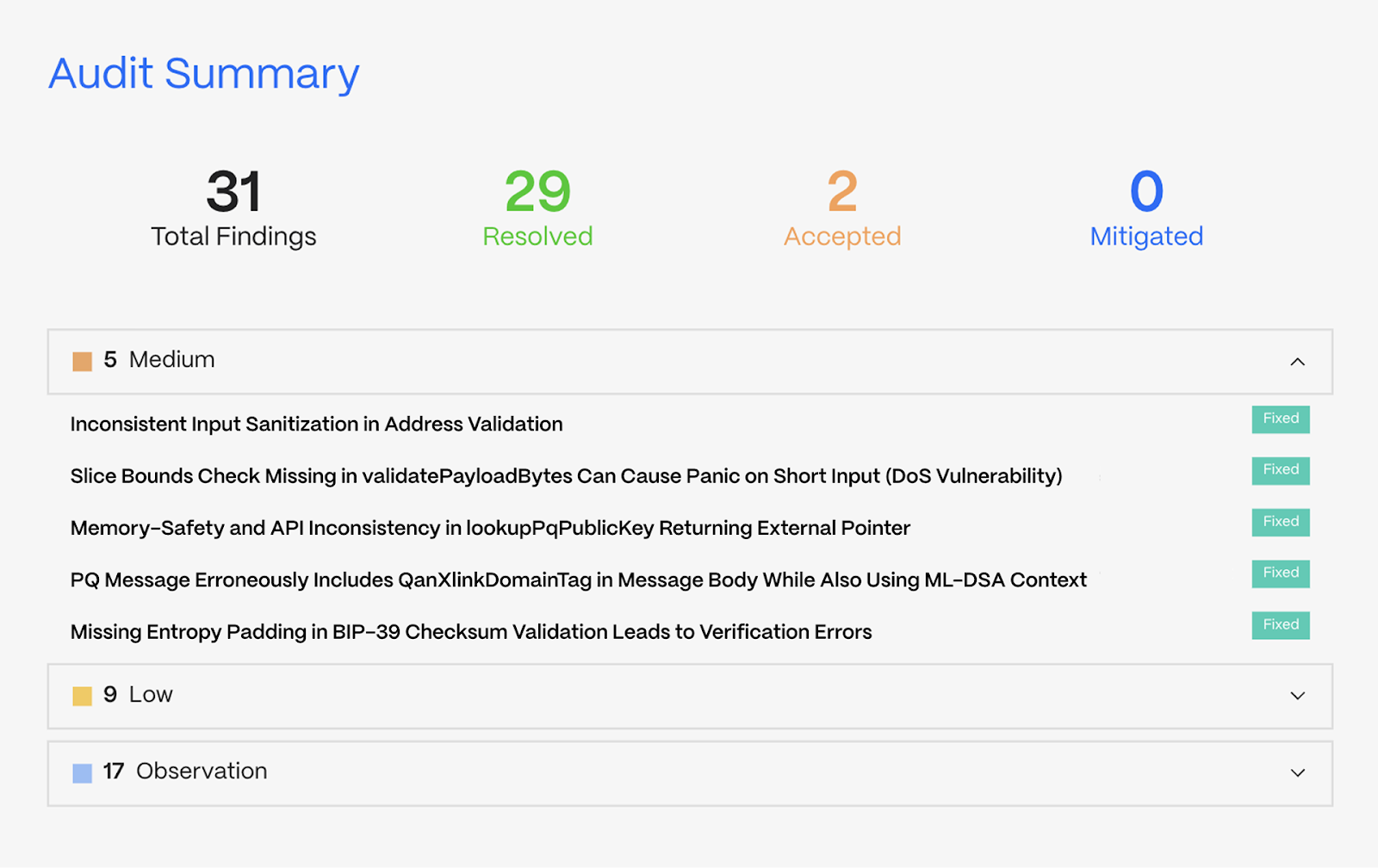 After remediation and retest, 29 of 31 findings were resolved. The 2 accepted findings were acknowledged by QANplatform by design decision.