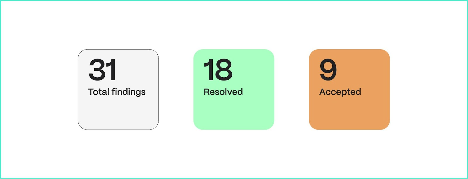 Staking & Committee (UUPS, role‑gated): 31 findings → 18 resolved, 9 accepted, 4 mitigated.