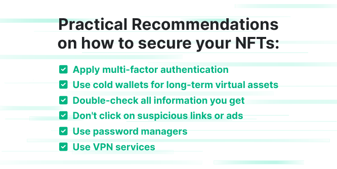 Since NFTs are virtual assets, users need to follow cybersecurity recommendations similar to the ones applicable to cryptocurrencies. Users should apply multi-factor authentication wherever they can. A large number of recent hacks in the world of blockchain have been attributable to hot wallets. That is why users should try to store their long-term virtual assets, especially when speaking about a huge volume of assets, on cold (hardware) wallets that have no connection to the cloud and, thus, are not subject to cloud cybersecurity risks.