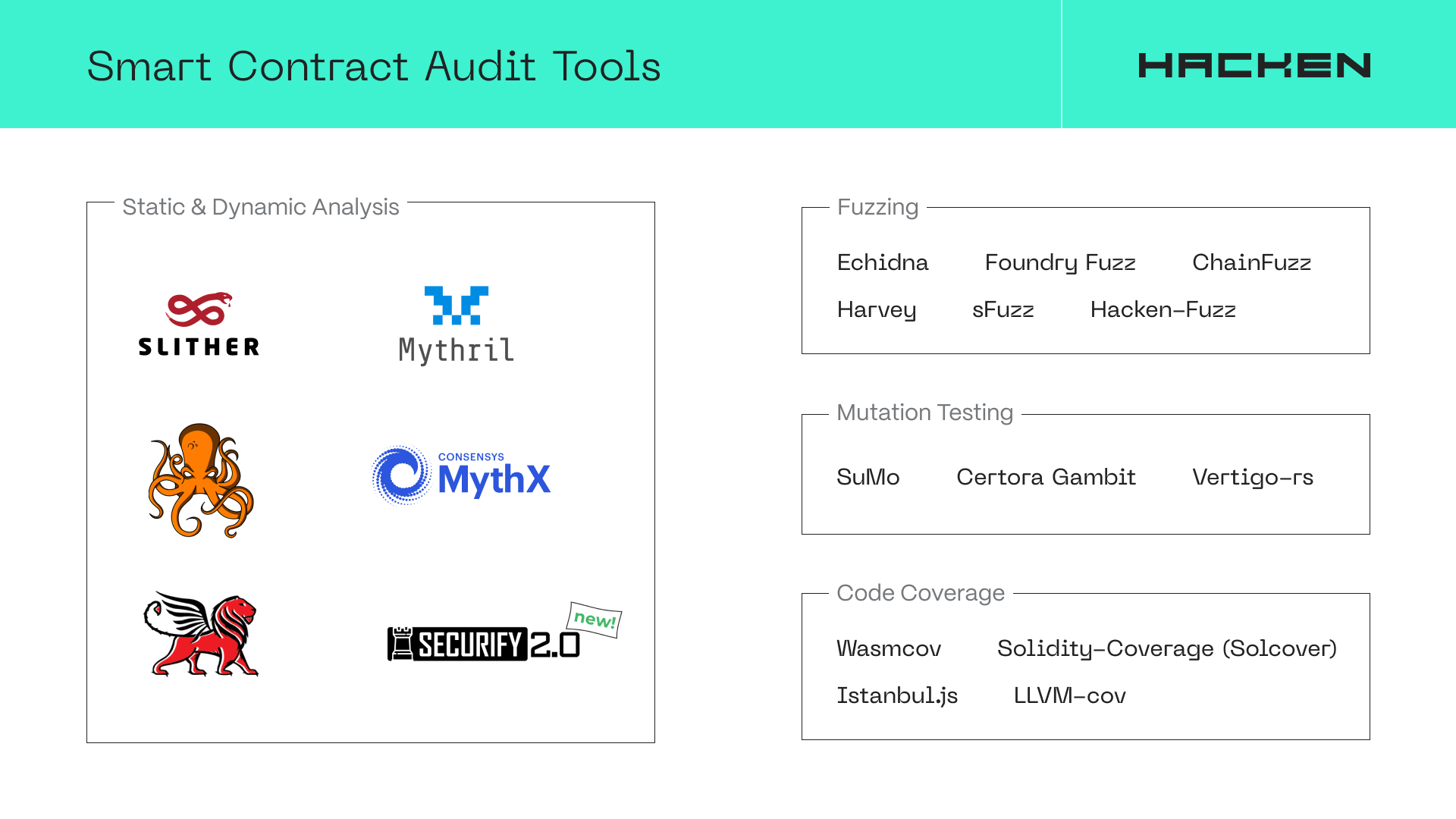 Tools like Slither are Mythril are commonly used for static and dynamic analysis; Echidna for fuzzing; SuMo for mutation testing; Solidity-coverage for code coverage in Solidity and Wasmcov for code coverage in Wasm environments.