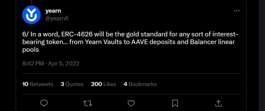A good example is how Yearn Finance came up with the idea of ERC-4626 and shared it with the whole DeFi community. ERC-4626 introduces a long-awaited standardization and tighter security of vault systems and yield-bearing tokens.