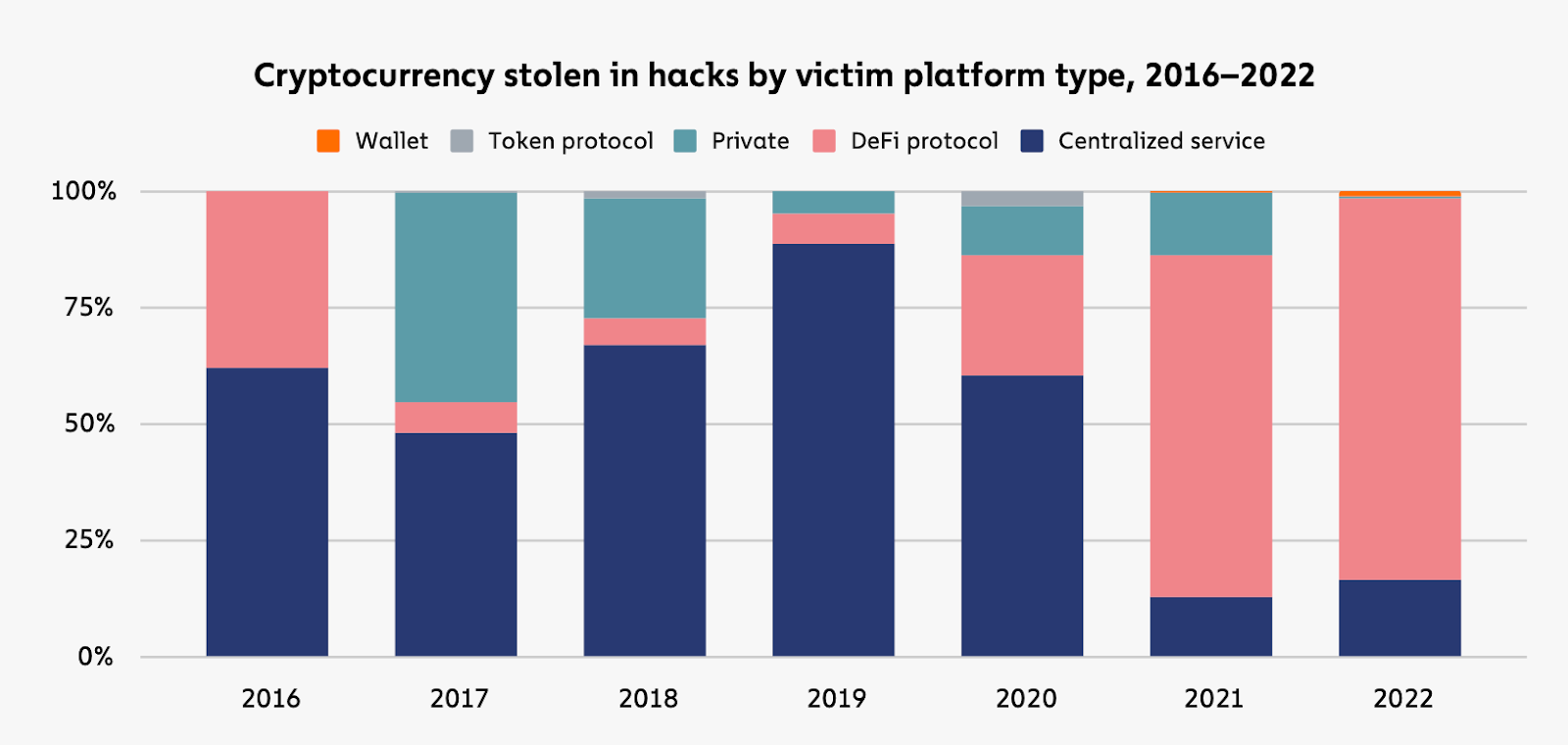 In 2022, a significant portion of cryptocurrency theft, amounting to $3.1 billion, was attributed to DeFi protocols, which accounted for 82.1% of the total stolen funds – yet another increase from the previous year’s 73.3%. Notably, 64% of the stolen funds were attributed to cross-chain bridge protocols.
