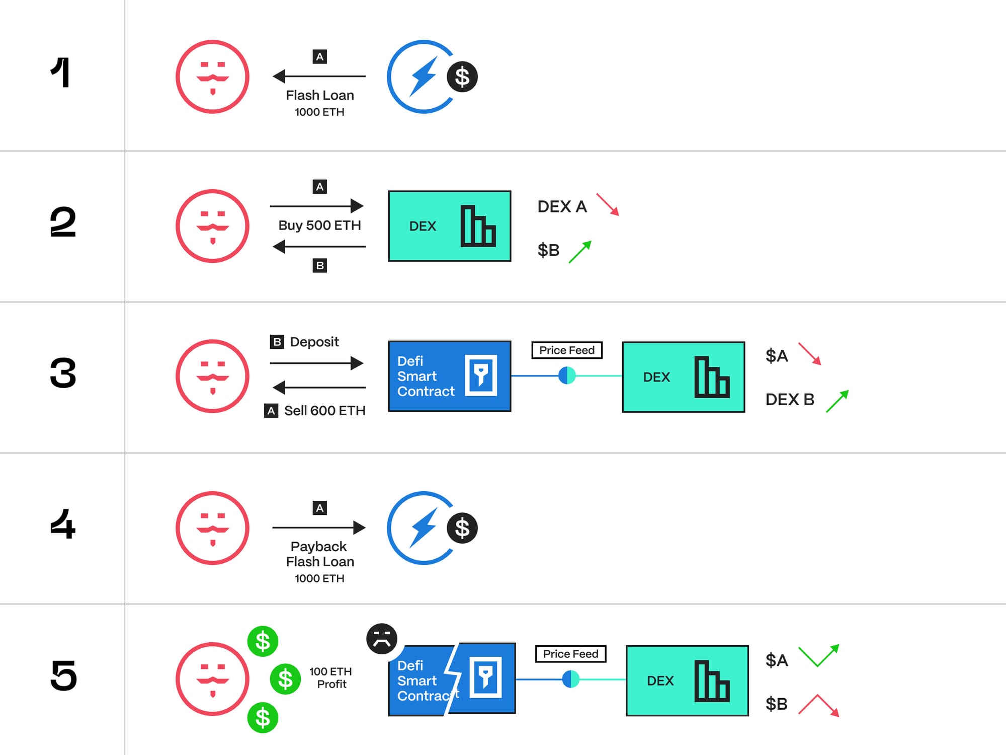 Let's say an attacker wants to exploit a vulnerability in a DeFi smart contract to steal funds. The attacker first takes out a flash loan of 1000 ETH (worth around $1.8 million at the time of writing) from a lending platform. The attacker then uses 500 ETH to buy a cryptocurrency that is undervalued on one exchange and overvalued on another exchange.