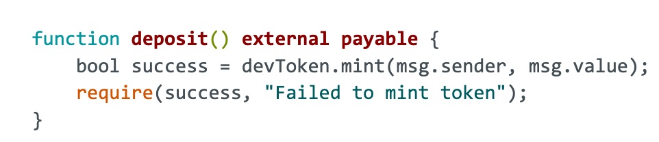 }The VulnerableWallet contract receives Eth and mints Dev tokens according to the deposited amount and vice versa; it allows withdrawing deposited Eth by returning the held Dev tokens.