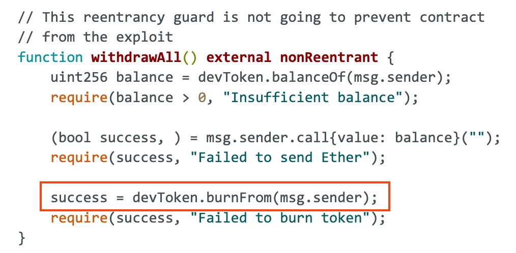 Initially, an attacker deposits some Eth and receives Dev tokens. When the attacker’s contract calls the withdrawAll function, it sends Eth to the attacker and triggers the attacker’s receive function before updating the Dev token balance in the DevToken contract (success = devToken.burnFrom(msg.sender)). In the malicious receive function, the contract performs a call to the DevToken contract to transfer Dev tokens to another malicious address before its state is updated, leading to double spending.