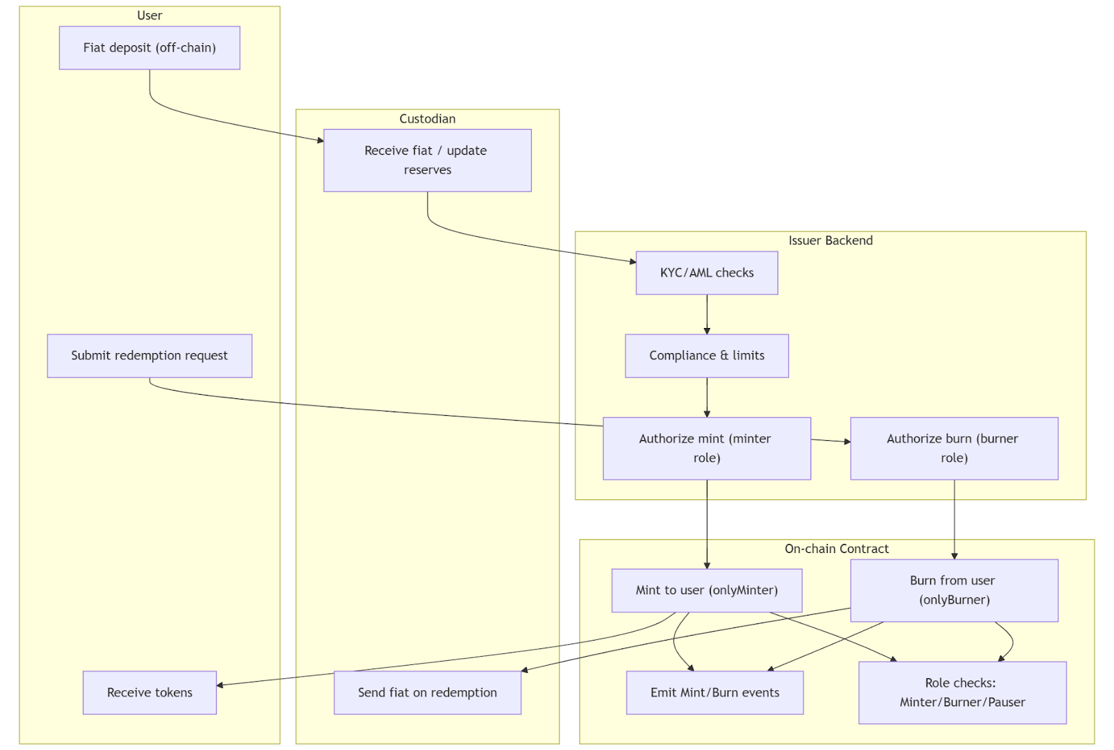 - For redemption: user calls burn(), and the issuer wires fiat back off-chain.