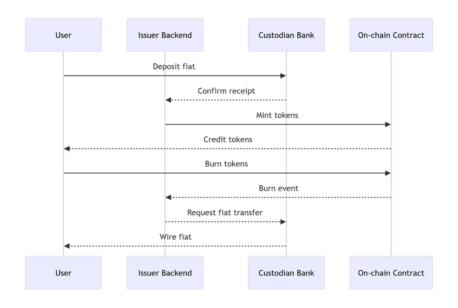 - User wires fiat to the issuer’s custodian bank.