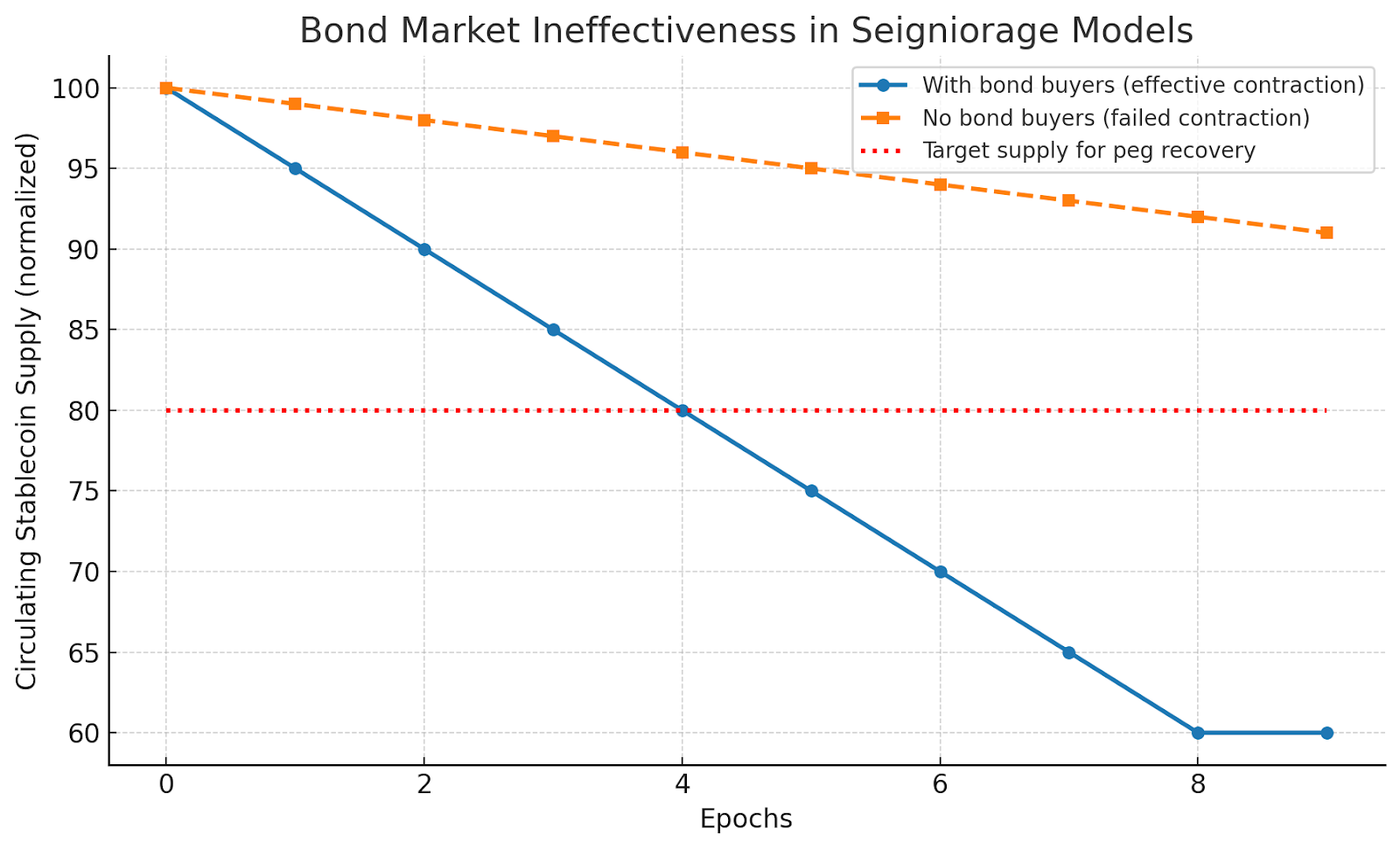 The chart compares two scenarios during a contraction phase when the stablecoin trades below $1. In the effective case (blue), users buy bonds by burning stablecoins, reducing circulating supply and moving toward the target level needed to restore the peg. In the failed case (dashed), no one buys bonds, so supply remains almost unchanged. Without contraction, the peg cannot recover, confidence erodes further, and the system risks permanent depeg.