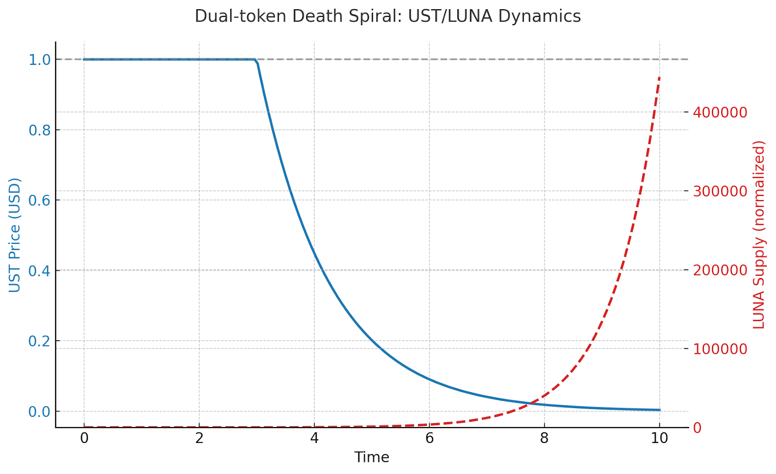 Figure: Dual-token death spiral dynamics. Once UST loses its $1 peg (blue), redemptions mint massive amounts of LUNA (red). The absorber token supply hyperinflates, its value collapses, and both tokens are ultimately destroyed.