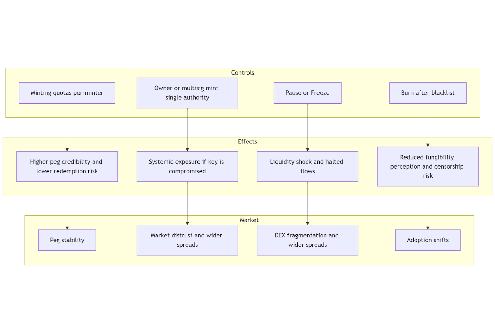 Figure: On-chain controls map to immediate economic effects, which propagate to market impact.