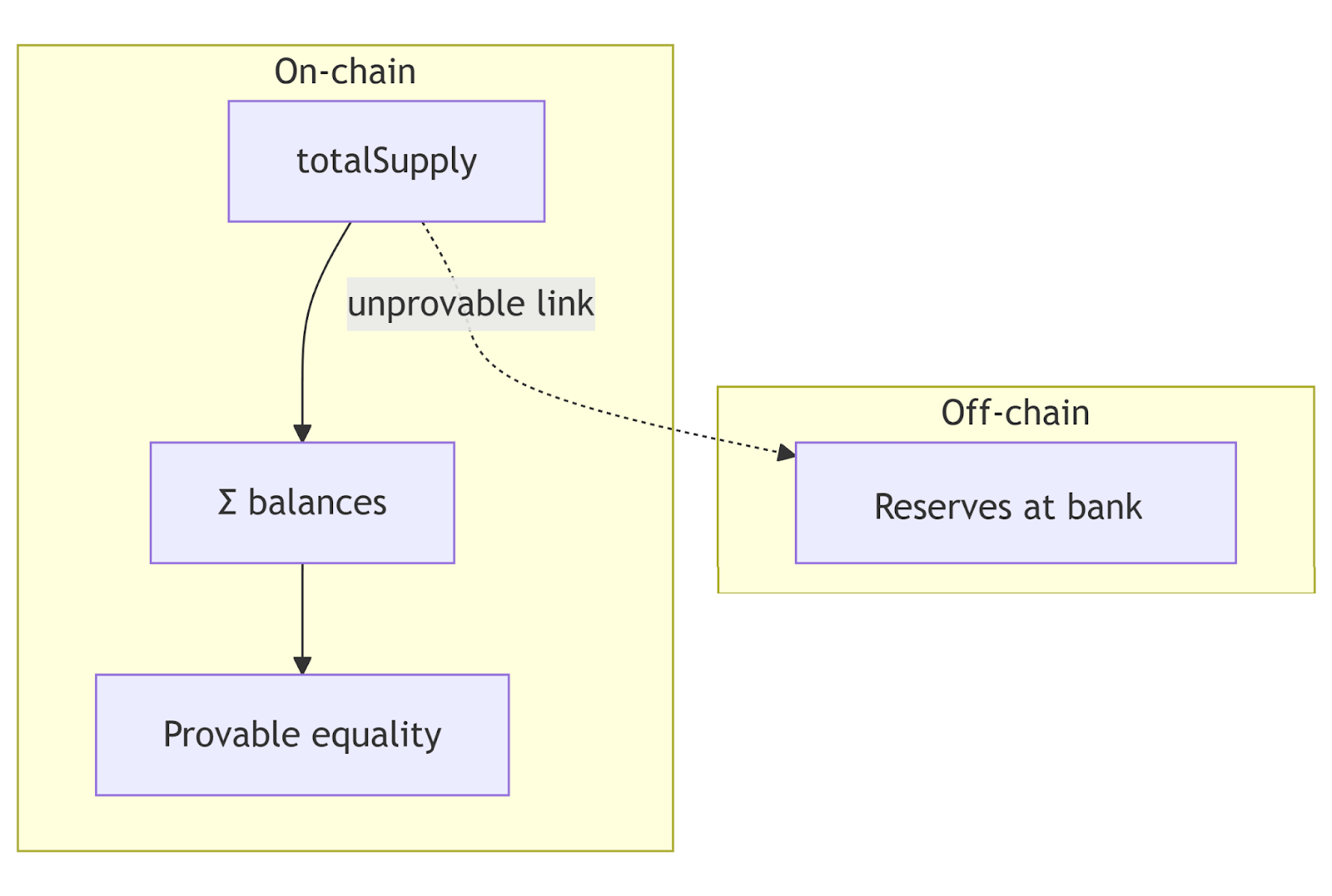This creates the central gap: on-chain state is provable; off-chain reserves are not. However, this gap can be partially bridged via external, off-chain proofs such as financial audits, attestations, or recurring proof of reserves reports.