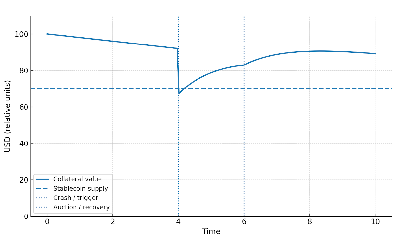 Figure: Liquidation risk under a sharp price crash. Collateral value (solid blue) falls below circulating stablecoin supply (dashed), triggering liquidation at the crash marker. The auction/recovery marker shows partial restoration, but not to pre-crash levels. Repeated events erode solvency and confidence in the peg.