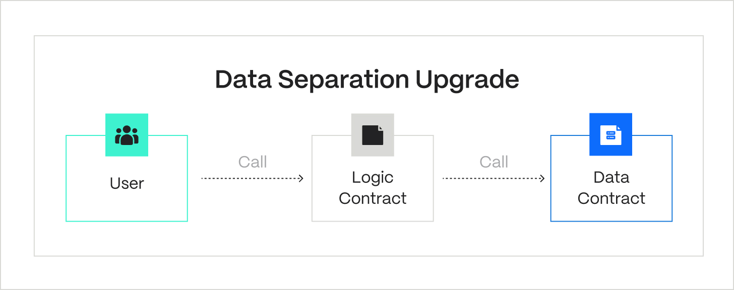 The earliest and most intuitive method of updating smart contracts with no state migrations is the data-separation pattern. Here, we separate a smart contract into logic and storage contracts, storing and changing the state respectively. The problem with this method is evident: constant calls between logic and storage require gas.
