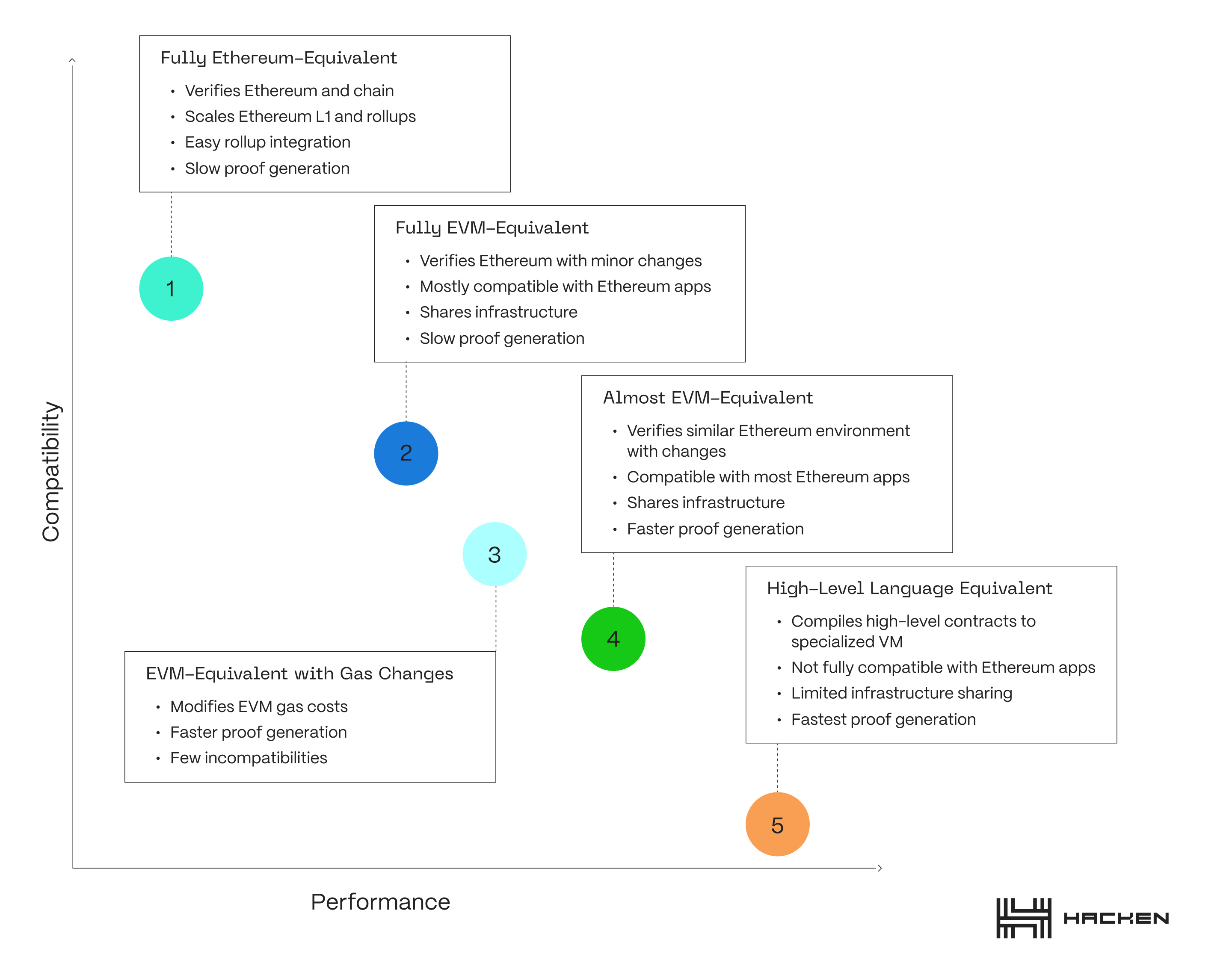 - Compatibility Trade-offs: Achieving full compatibility with the Ethereum protocol while maintaining efficient proof generation can be challenging. Different zkEVM implementations make trade-offs between compatibility and performance, as outlined in the zkEVM types discussed earlier.