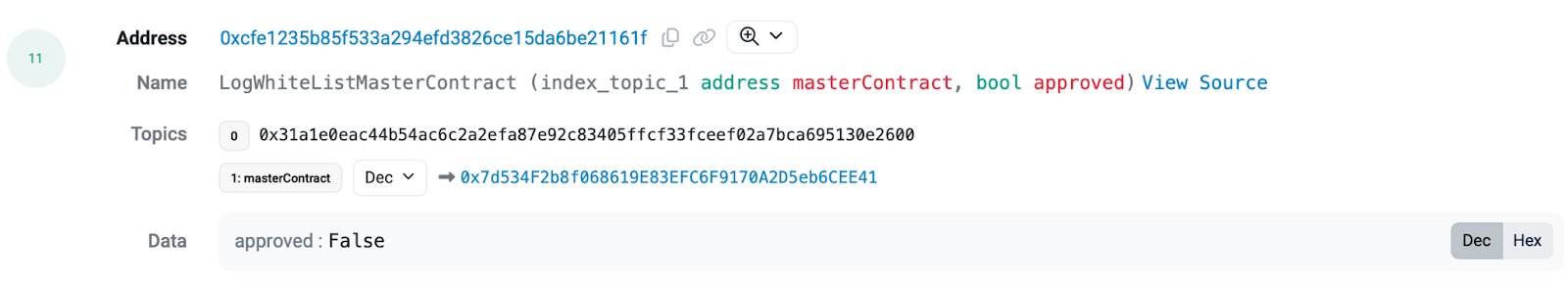 Synnax runs a forked version of Abracadaba’s protocol on the SEI chain. Three days before the MIM hack, Synnax paused operations by unwhitelisting a CauldronV4 master on DegenBox.