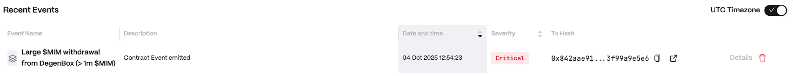 Extractor by Hacken detected the incident by flagging abnormal activity and an unusually large MIM withdrawal from DegenBox. Its alert breakdown showed a total of about 1.79 million MIM withdrawn during the attack.