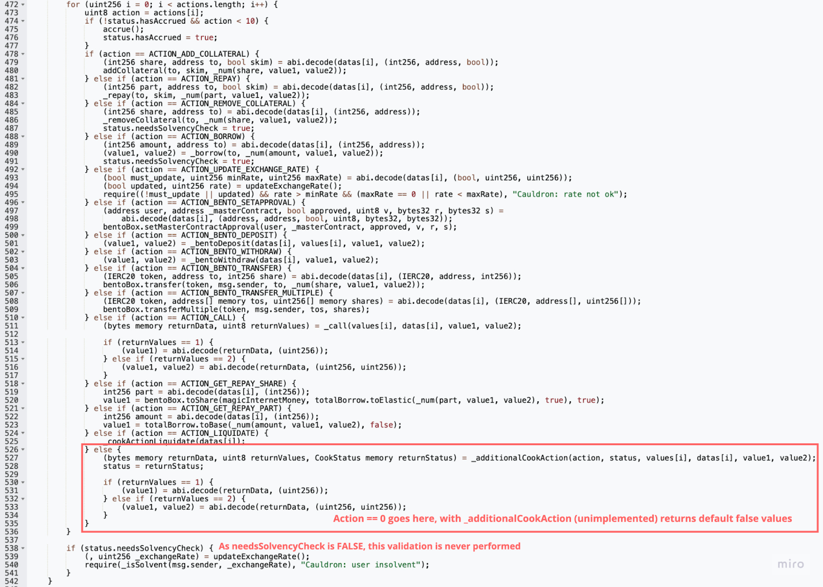 Abracadabra’s cook() function batches multiple actions into a single transaction. A bug in how cook()’s auxiliary action hook was implemented created a vulnerability where an attacker could bypass the post-transaction solvency check and withdraw borrowed MIM with no collateral.