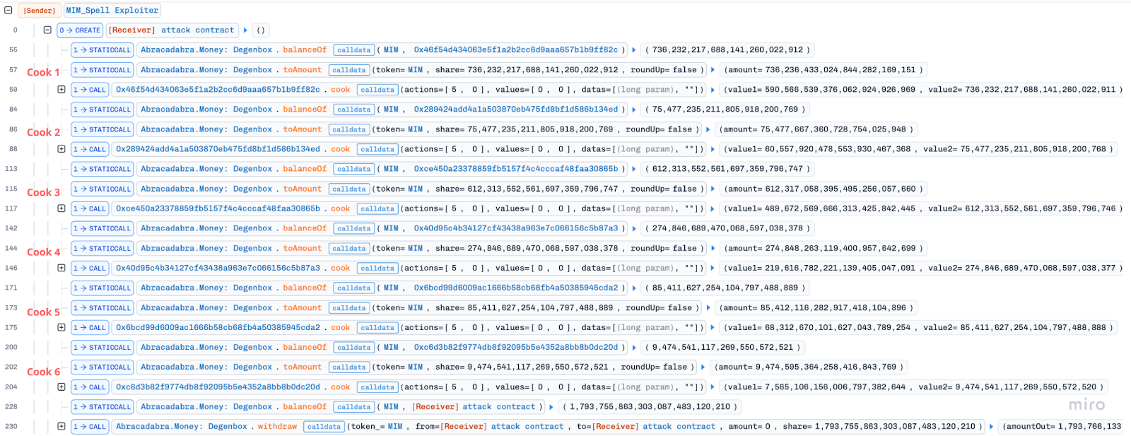 The attack was executed in a single transaction that iterated through six vulnerable Cauldrons, borrowing the maximum available MIM on each.