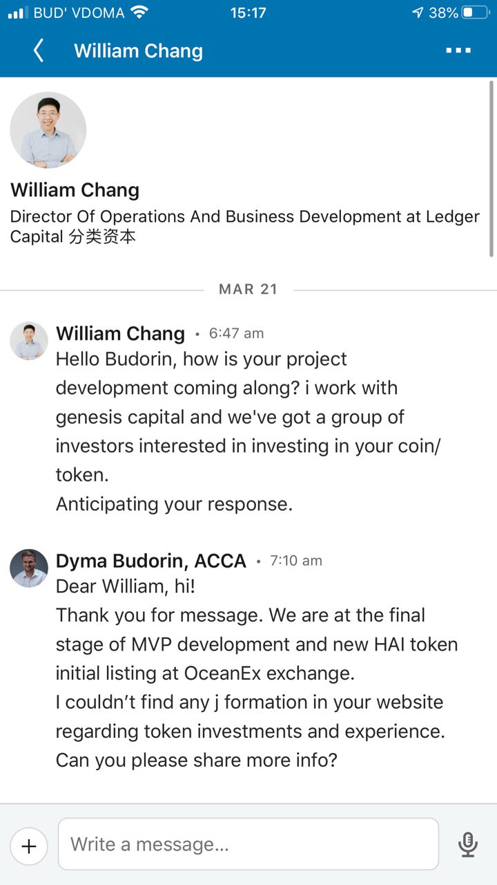 On March 21, Mr. Budorin, Haсken CEO, received a message from a man who said that he works with Genesis Capital and that he has a group of investors interested in the HakcenAI project.