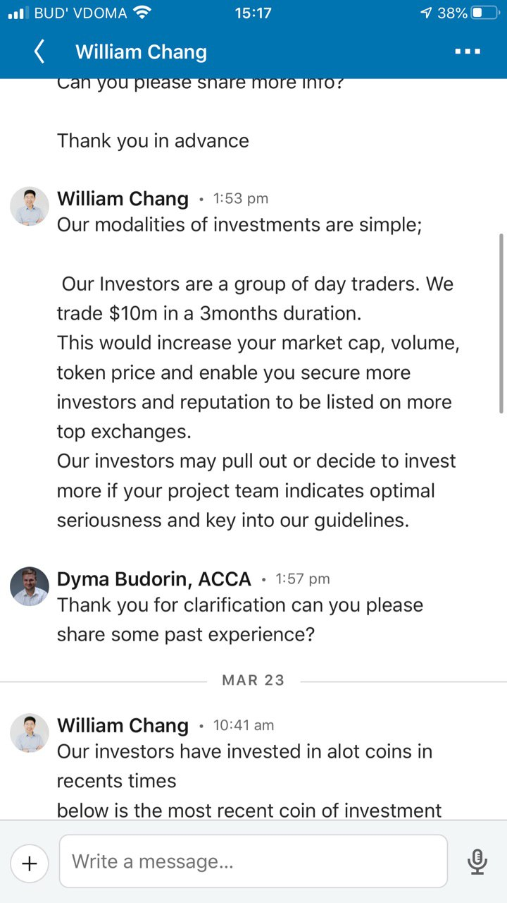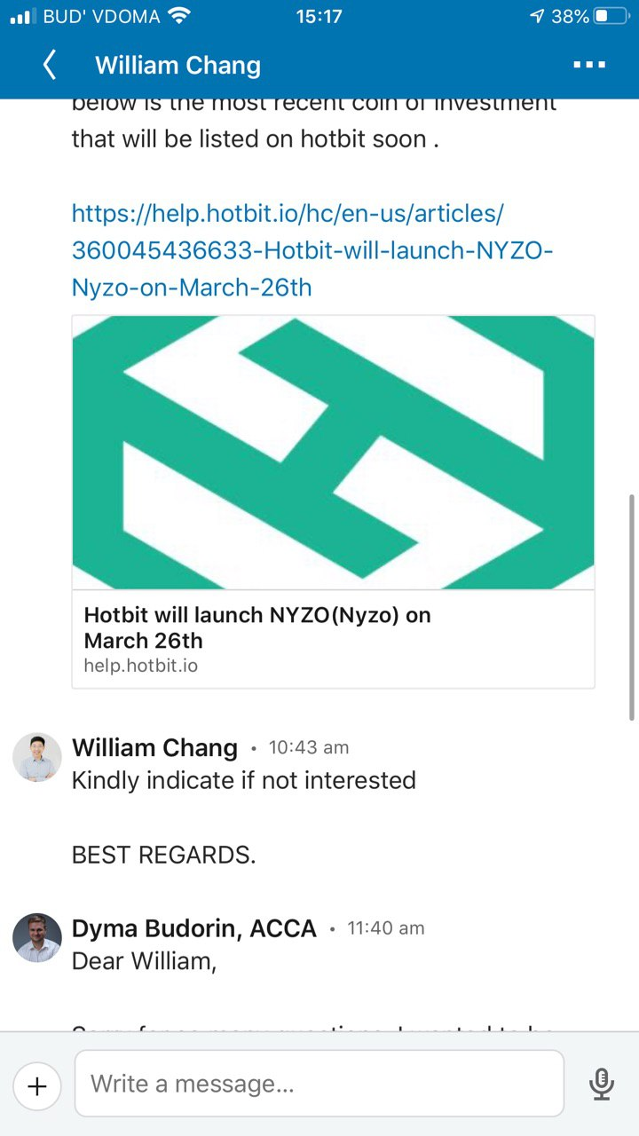 Then conversation has been moved to telegram and Mr. Budorin got a message from a fake Hotbit listing coordinator.