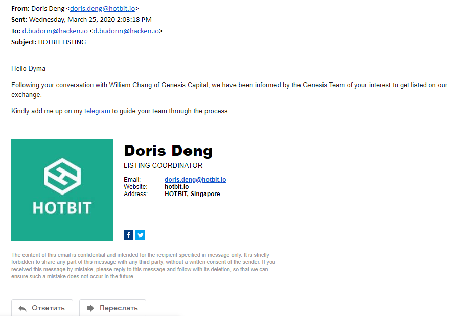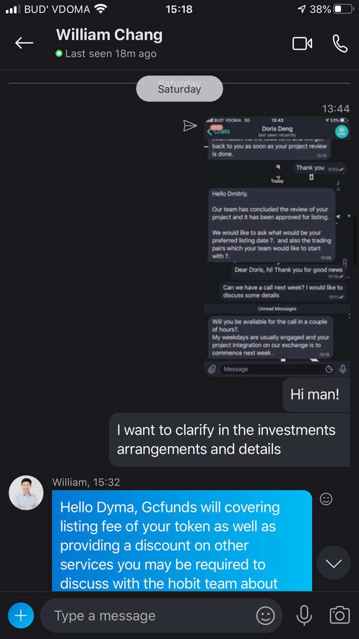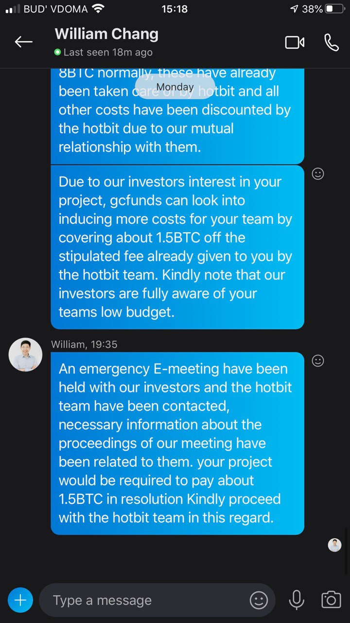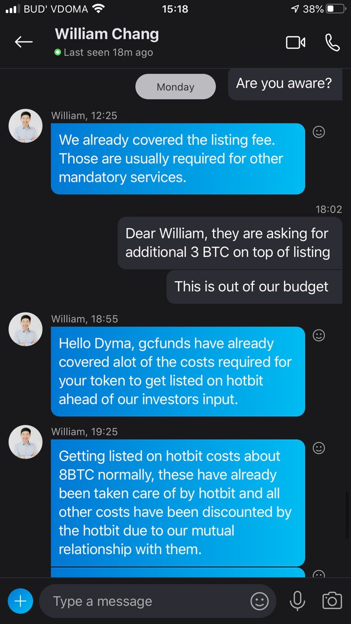 According to this document listing fee equals 3 BTC. This is not a big price in the realities of the cryptocurrency market. Scammer admitted that normal Hotbit listing fee costs 8 BTC but they will make a “special” discount due to good relationship of a Hotbit with Genesis Capital.