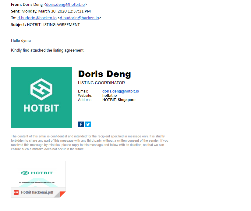 In the second email scammers sent us a “Hotbit listing agreement”.