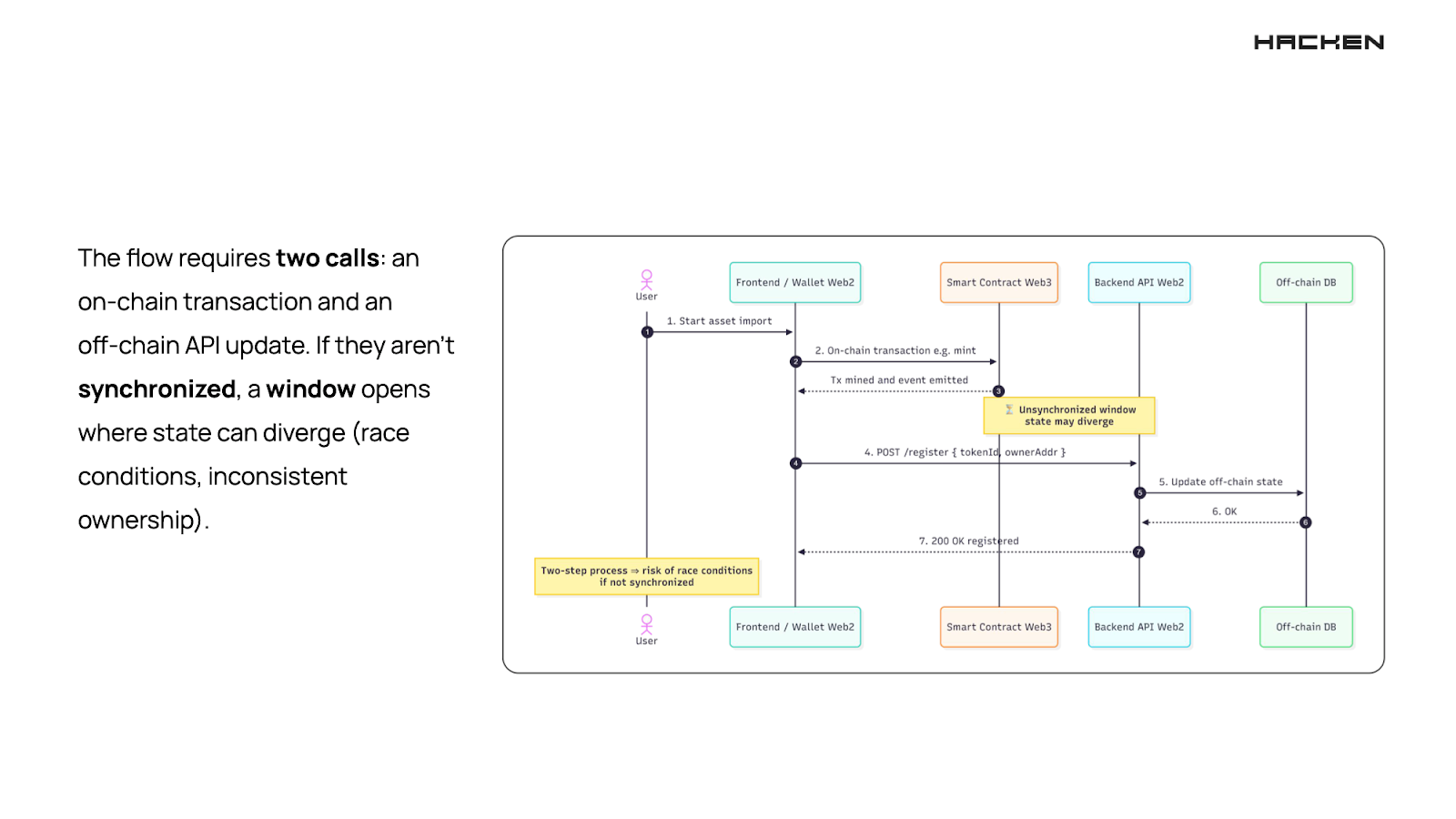 A split-call workflow appears when a single business action is divided across two separate calls — for example, minting an NFT on-chain and then registering it in the backend through an API. When these steps are not tightly synchronized, a gap opens where the on-chain and off-chain states can diverge. That divergence becomes a window for exploitation.