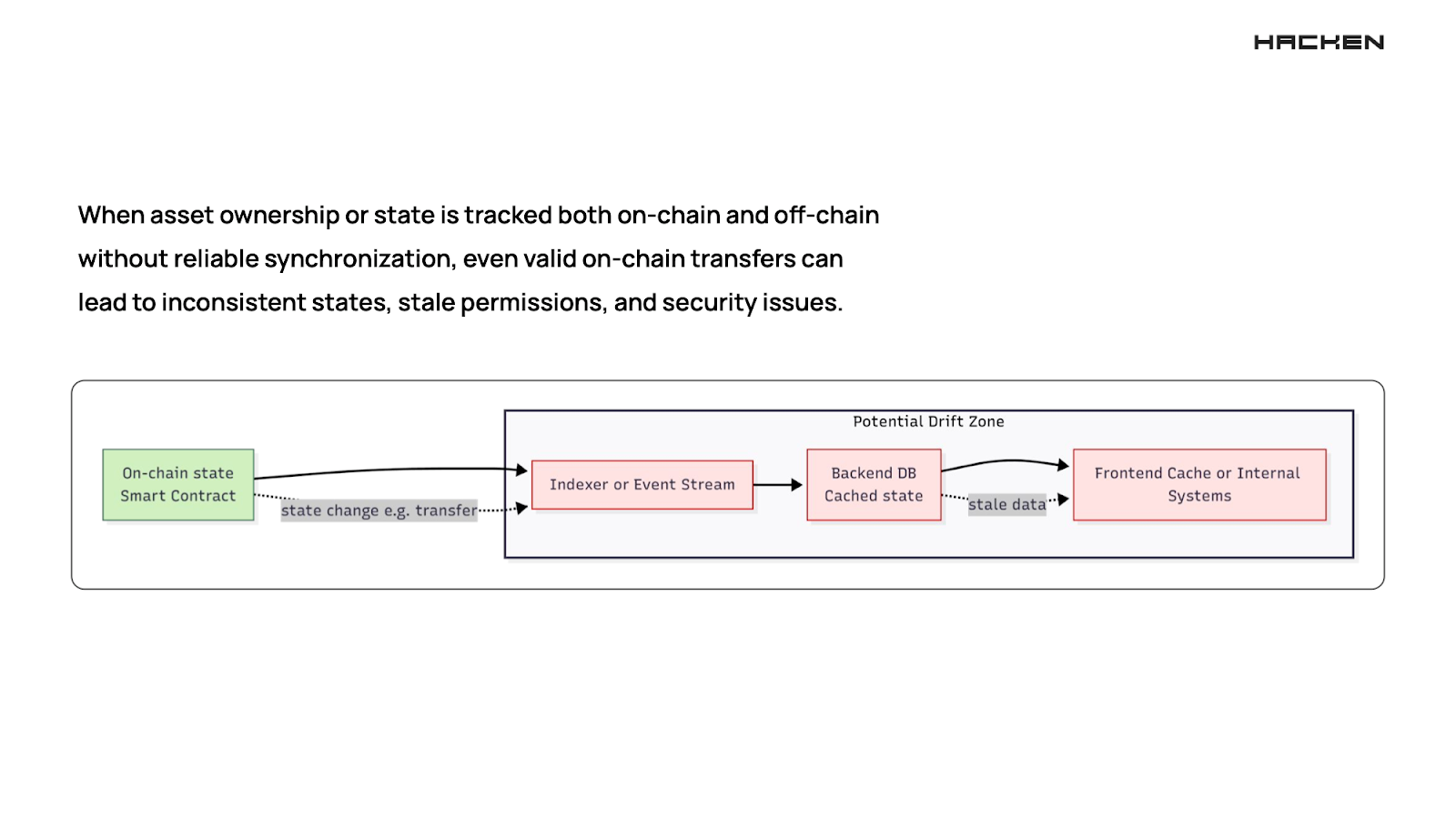 Multi-source state drift occurs when an application tracks asset ownership or other critical data in two places — on-chain and in an off-chain database. If synchronization between these sources is delayed or unreliable, the backend may end up relying on stale information. Even valid user actions can then produce incorrect behavior, because the system no longer reflects the real blockchain state.