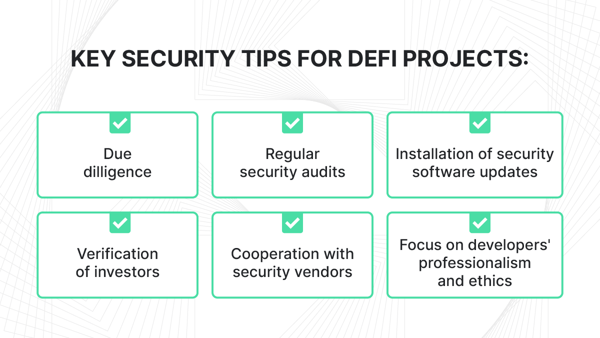 DeFi safety is the responsibility of both projects and investors. The most effective way for investors to address DeFi risks is due diligence. At the same time, to mitigate the risk of DeFi hacks, projects should pass regular security testing and complete the audit of their smart contracts before listing. Also, technological enterprises introduce new updates and patches for DeFi solutions to allow them to eliminate security vulnerabilities before hackers get to know about them. The faster a project applies these security updates, the higher its chances to prevent a DeFi hack.