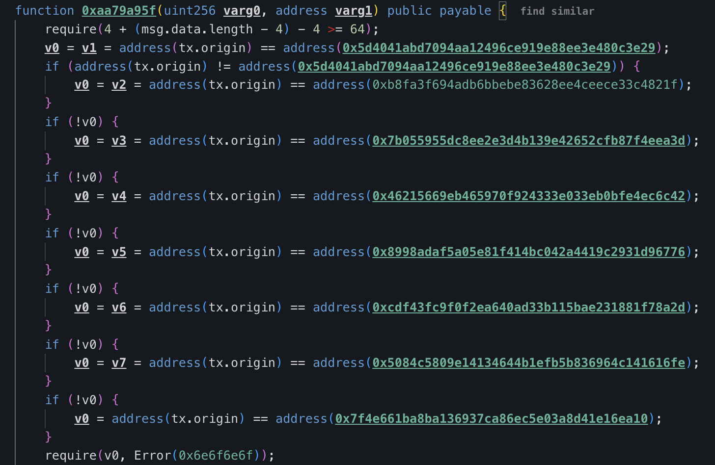 The contract checked whether tx.origin matched one of the following hardcoded addresses: