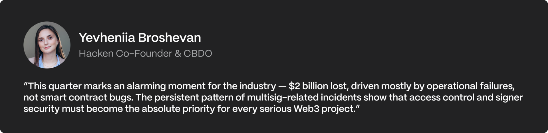 Three quarters in a row, the biggest hacks involved Safe multisig wallets — not due to smart contract flaws, but due to weak operational security. Extractor, Hacken's detection engine, shows how teams can defend against these failures.
