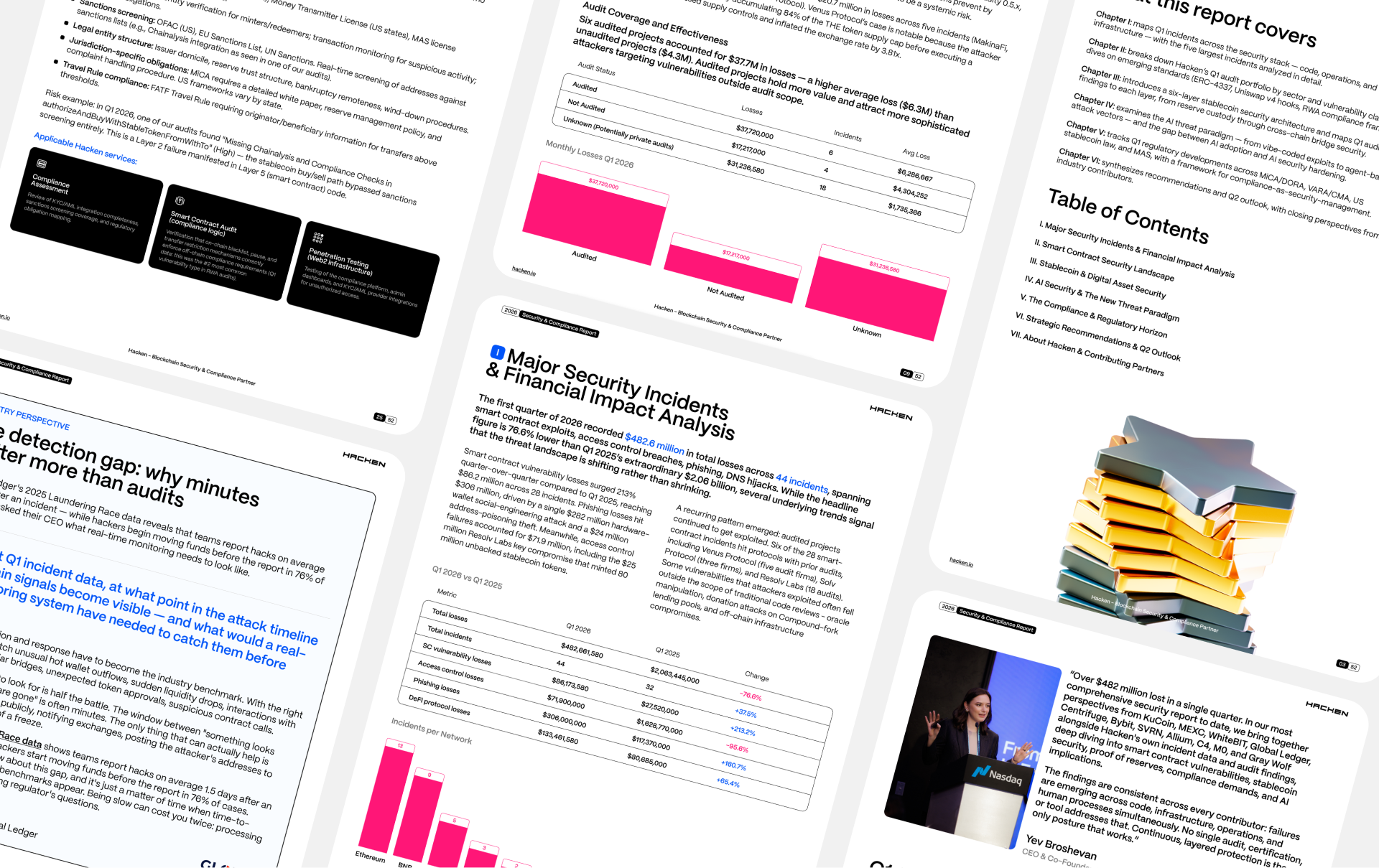 Today, Hacken releases the Q1 2026 Security & Compliance Report — our most comprehensive piece to date, bringing together incident data, audit portfolio analysis, and perspectives from 11 industry leaders to answer one question: why does the industry keep losing money to problems it already knows how to solve?