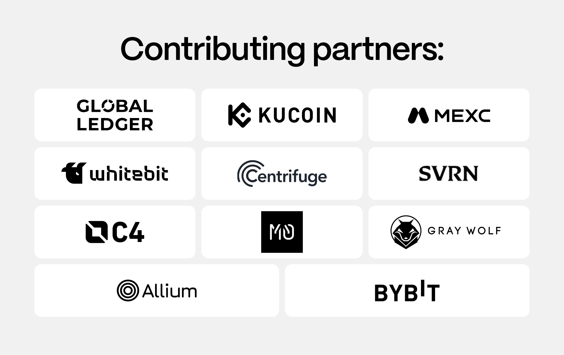 This report was developed alongside 11 leading teams across exchanges, protocols, analytics, infrastructure security, and compliance — KuCoin, MEXC, WhiteBIT, Bybit, Centrifuge, Global Ledger, Allium, SVRN, M0, C4, and Gray Wolf. Their perspectives shaped every chapter, grounding the analysis in operational reality rather than observation from the outside.