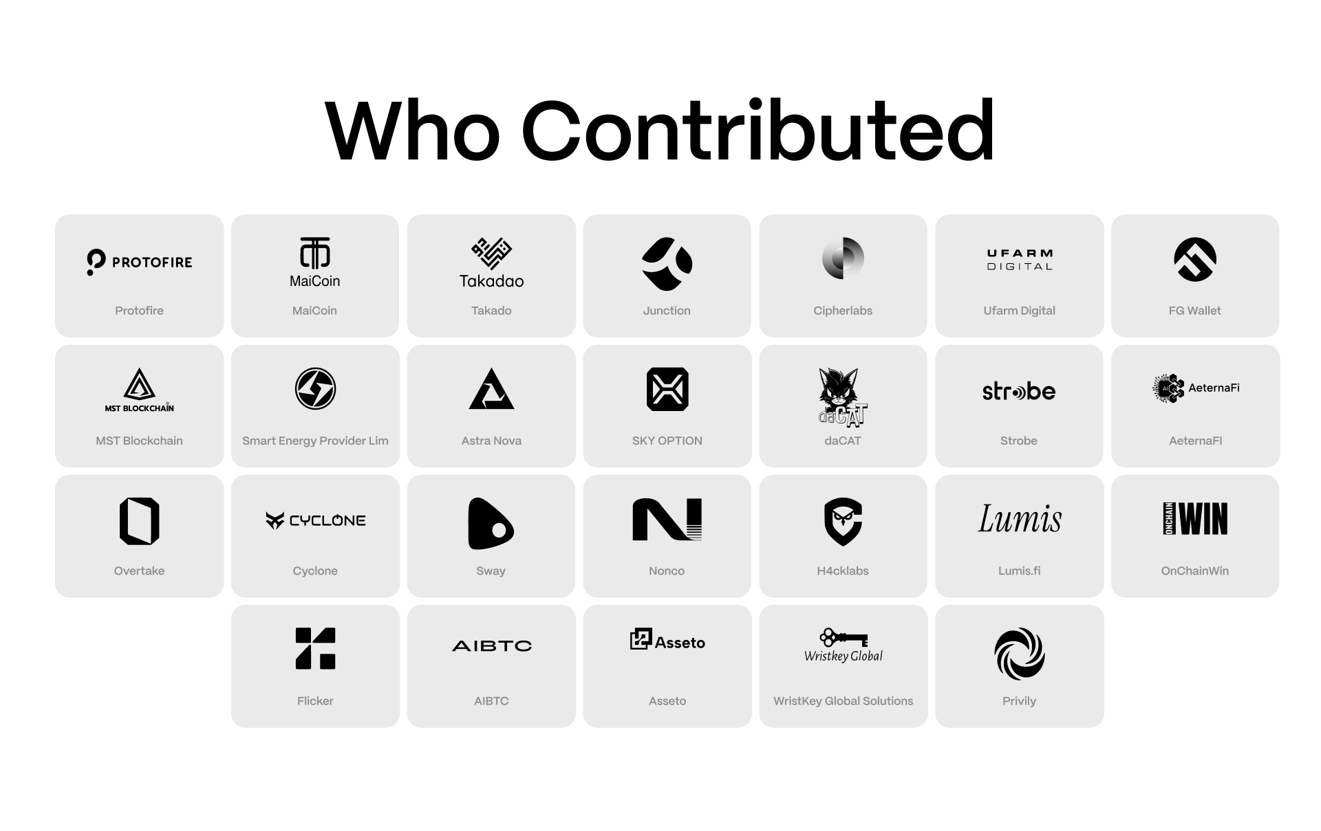 Protofire DAO, MaiCoin, Takadao, Junction, Cipherlabs, MST Blockchain, Strobe, FG Wallet, AeternaFi, Overtake, CycloneChain, SKY OPTION, daCAT, Sway, Astra Nova, Lumis.fi, OnChainWin, Flicker, Nonco, UFarm.Digital, Asseto, Smart Energy Provider Limited, Privily, AIBTC, WristKey Global Solutions.