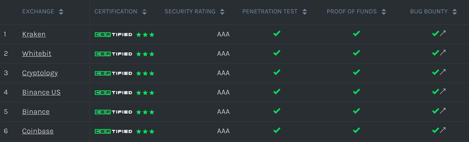 6 crypto exchanges have the highest rating AAA. They have almost all required cyber security components in place according to Cer.live methodology.