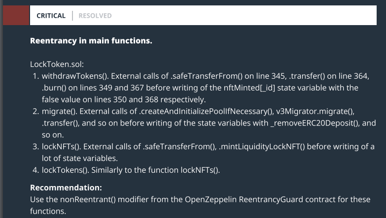 In our audits, we found 2 medium and 2 low-level issues in the following functions: createMultipleLocks and lockTokens, both in the LockToken.sol contract. These functions have never been exploited. On top of that, the notorious “v2 to v3 migration function” was not featured in the contracts that Hacken audited back in February 2022.