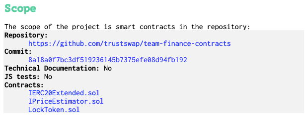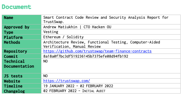 In February 2022, Hacken auditors reviewed and analyzed the smart contract for Team Finance contracts of Trust Swap.